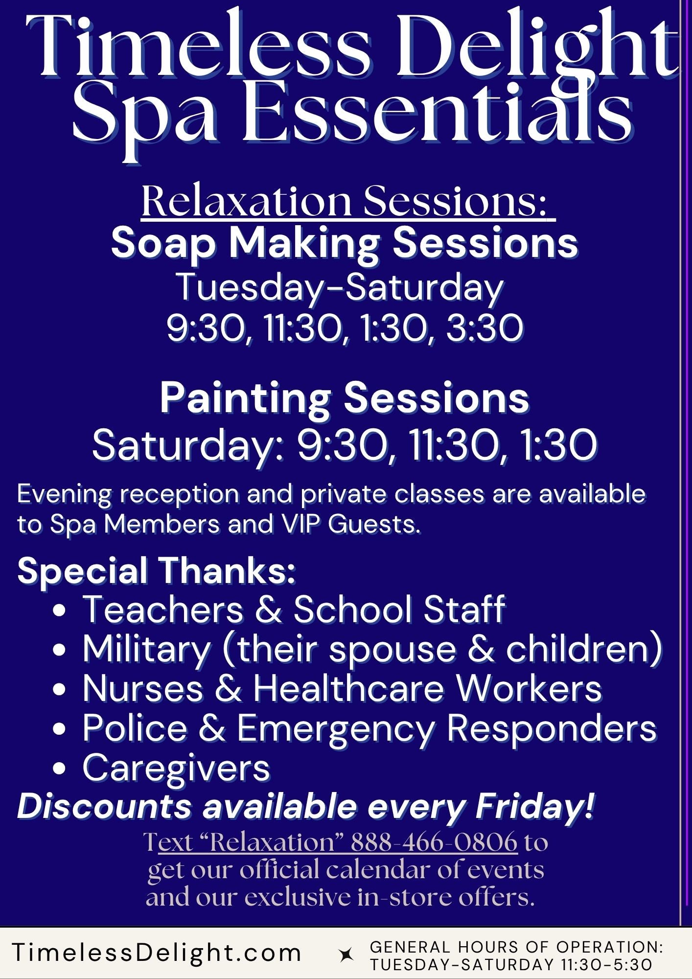 Text the word “Timeless” to 888-466-0806 for exclusive offers, pop-up shops and in store events from Timeless Delight Spa Essentials.