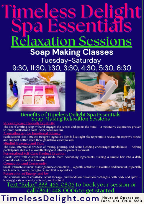 A creative stress-relief experience where guests handcraft personalized soap using high-quality natural ingredients like shea butter, glycerin, and essential oils. The focus is mindfulness—slow, intentional movements, and the calming rhythm of creation. These classes are taught by LaTasha Elliott, who has been making soap for her family since 2014. -